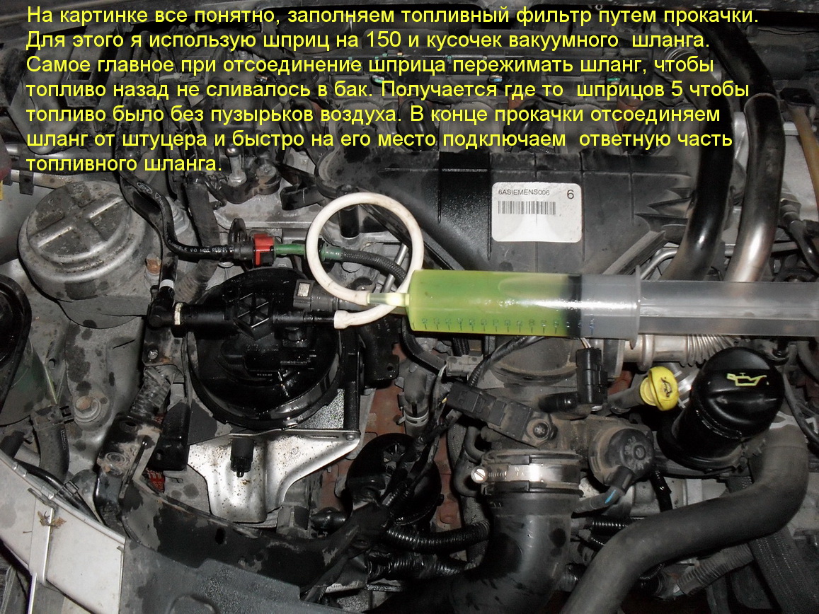 3 Если вы плохо прокачали топливо через фильтр и двигатель поработав несколько секунд заглох повторите процедуру прокачки фильтра плюс заполните топливную магистраль до насоса топливом. Для этого заполненный шприц на 150 топливом вставляем в штуцер топливного шланга он как раз плотно садится и выдавливаем топливо из шприца тем самым заполняем топливную магистраль и сам насос топливом. После такой процедуры двигатель легче будет завести.
